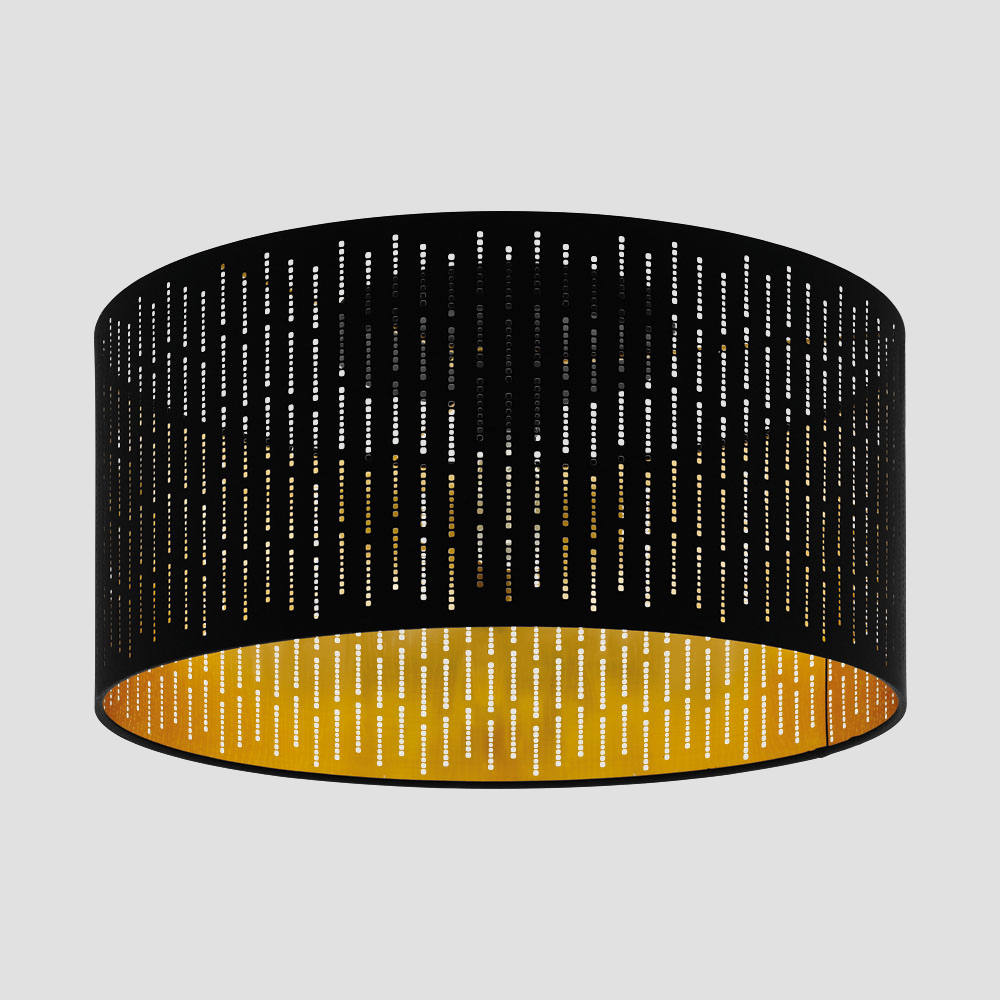 Este o plafoniera EGLO cu un design concept, din otel si material textil. Suportul plafonierei si suportul de fasung sunt vopsite in culoarea neagra. Abajurul este construit din material textil cu decupaturi fine, liniare, asezat peste un cadru metalic.